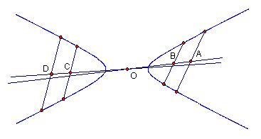 (1)畫雙曲線的兩條平行弦,並分別作它們的中點A,B,連線AB。