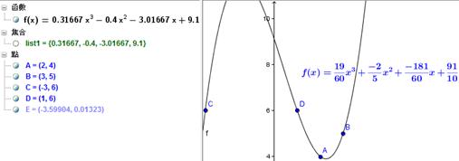 , 5)、C(-3 , 6)、D(1 , 6),求通過此四點的最低次多項式:輸入Polynomial[{A, B, C, D}],調整ABCD的坐標,觀察圖形變化,如果新增第 5 點E,則修改f(x)屬性,在定義裡面將Polynomial[{A, B, C, D}]改成Polynomial[{A, B,