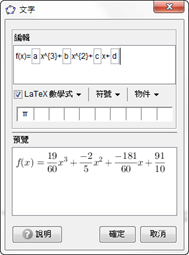 得到最逼近的三次函數 f(x)=0.32x3-0.4x2-3.02x+9.1,若調整選項中的小數點位數為4位,可得f(x)=0.3167x3-0.4x2-3.0167x+9.1。4.1板之前,小數點只能呈現最逼近的函數,4.2版以後使用SurdText[]函數,可在幾何圖形區呈現分數,插值多項式為